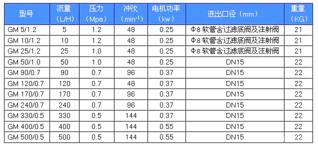 GM型隔膜式計(jì)量泵可調(diào)計(jì)量范圍:0-400L/H 壓力范圍:0-1.0MPa 驅(qū)動(dòng)方式:電機(jī)驅(qū)動(dòng)220V 、380V 控制方式:手動(dòng)、自動(dòng)控制(可接收4-20mA信號來調(diào)節(jié)流量
